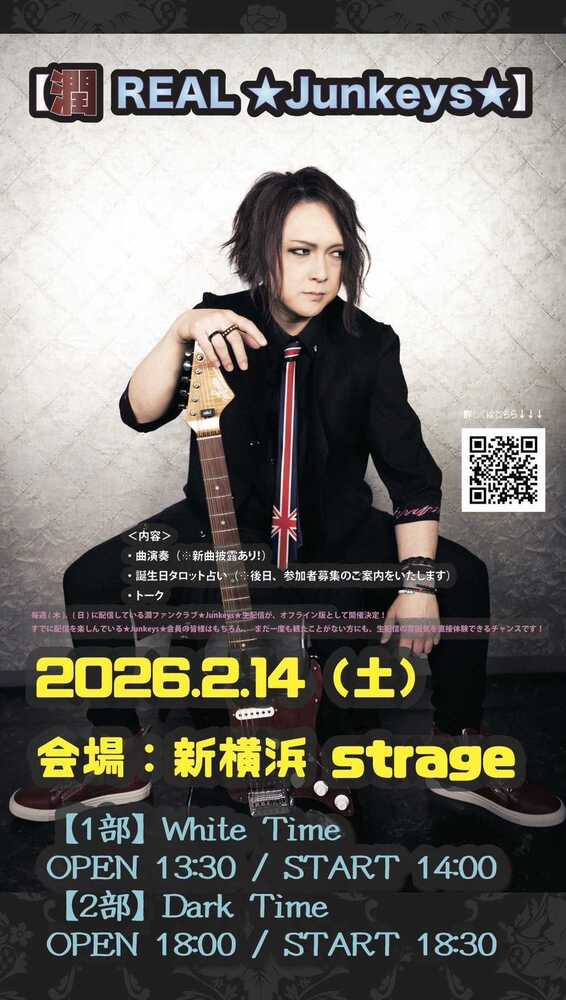 潤 REAL ★Junkeys★ ~【1部】White Time SCHEDULE 2026/02/14(土) 14:00 - 15:30 新横浜strage 地図を表示 2026.2.14(土) 新横浜strage 【1部】White Time OPEN 13:30 / START 14:00 ●TICKET 自由席 ¥5,000 ▼詳細 https://jun-0504.bitfan.id/contents/323705 URLをコピーする 報告する
